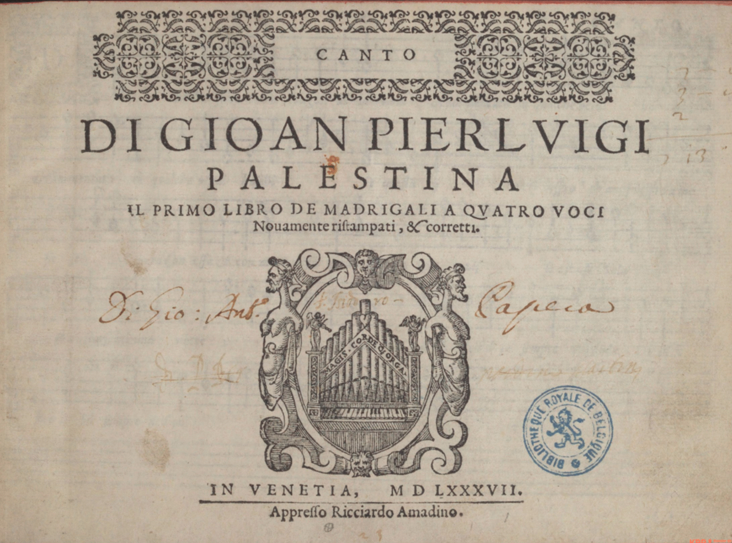 Titelblatt, aus: Giovanni Pierluigi da Palestrina, Il primo libro di Madrigali a quatro voci, Venedig: Ricciardo Amadino, 1587, Cantus-Stimmbuch